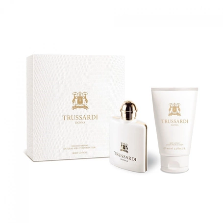 Zestaw zapachowy Trussardi Donna, w skład którego wchodzi woda perfumowana o pojemności 50ml oraz balsam do ciała o pojemności 100ml.