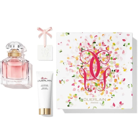 Zestaw zapachowy Mon Guerlain Bloom Of Rose, w skład którego wchodzi woda toaletowa 50ml, balsam do ciała 75ml oraz wisiorek z zawieszką.