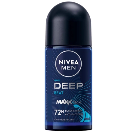 NIVEA MEN Deep Beat Antyperspirant roll-on z czarnym węglem i drzewną nutą zapewnia niezawodną ochronę antyperspiracyjną przez 48h oraz silną ochronę antybakteryjną. Po użyciu możesz cieszyć się długotrwałym, męskim zapachem oraz uczuciem suchej i czystej skóry. Bez widocznych czarnych pozostałości. Tolerancja dla skóry potwierdzona dermatologicznie.